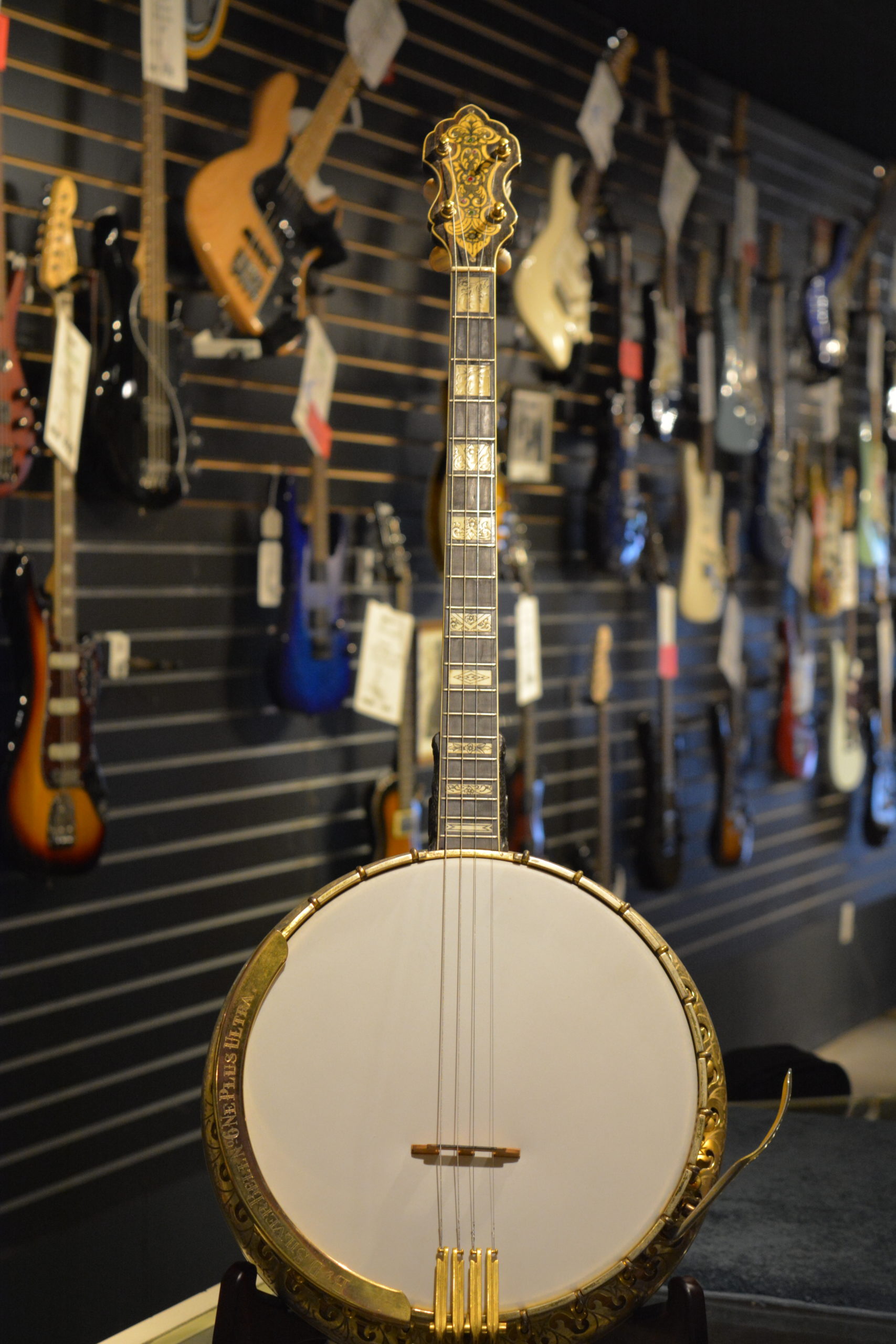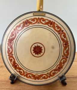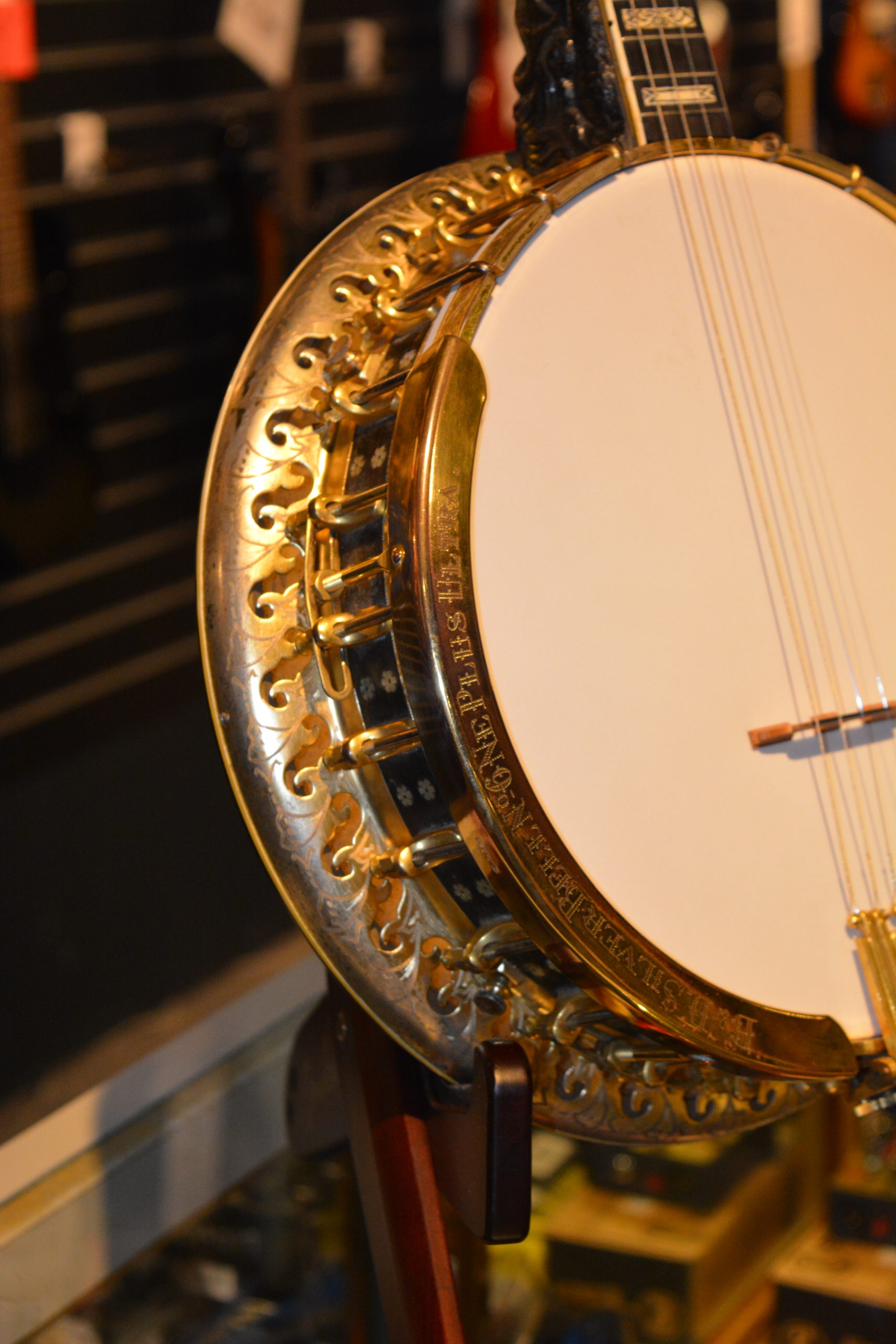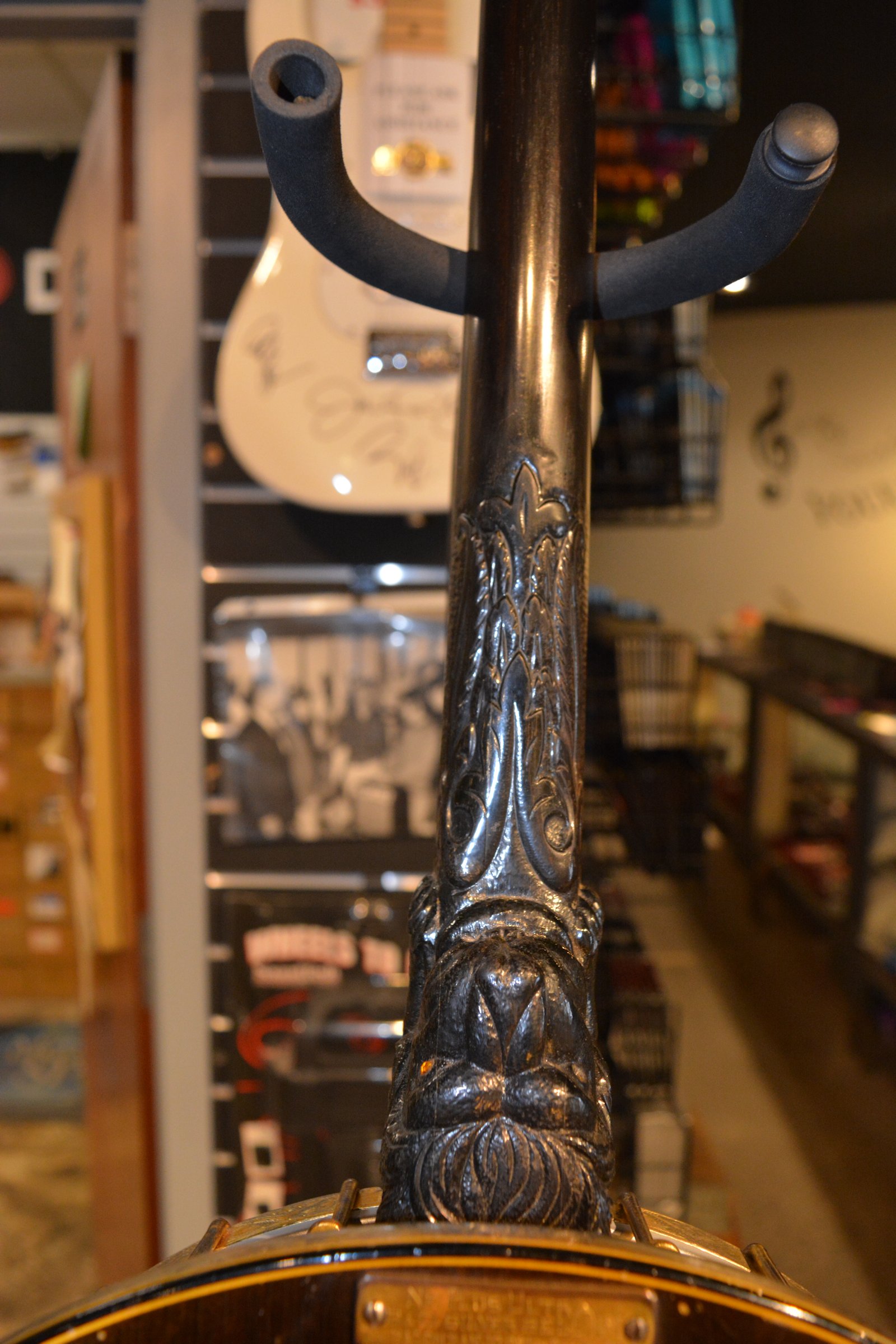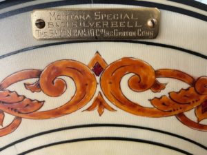 This fairly simple model was upgraded, as the #1 was never gold plated and did not have the colorful side and back. Also the armrest was engraved with Eddy’s artist name and was then gold plated. The head was later replaced with a transparent head. The Serial #18585 dates the banjo to 1925 (according to the late Polle Flanoe’s database a Silver Bell Montana TB#1 later partially upgraded).